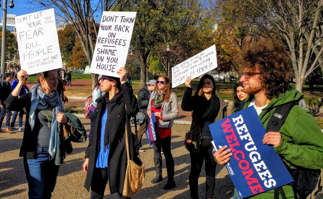More than 100 rally participants carried signs welcoming refugees, and chanted against a recent announcement by Republican Gov. Larry Hogan of Maryland that opposed refugee entry in the state. President Obama has committed to accepting 10,000 Syrian refugees in 2016. Republican governors of 31 states have said they won’t let those refugees in, though they have little legal authority to prevent the settlement.